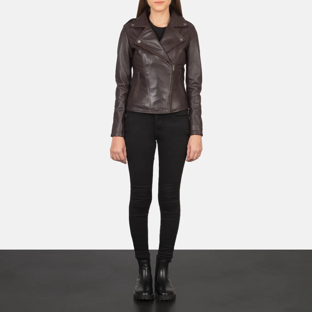 The jacket is a classic biker jacket, characterized by its asymmetrical zipper, wide lapels, and antique hardware.