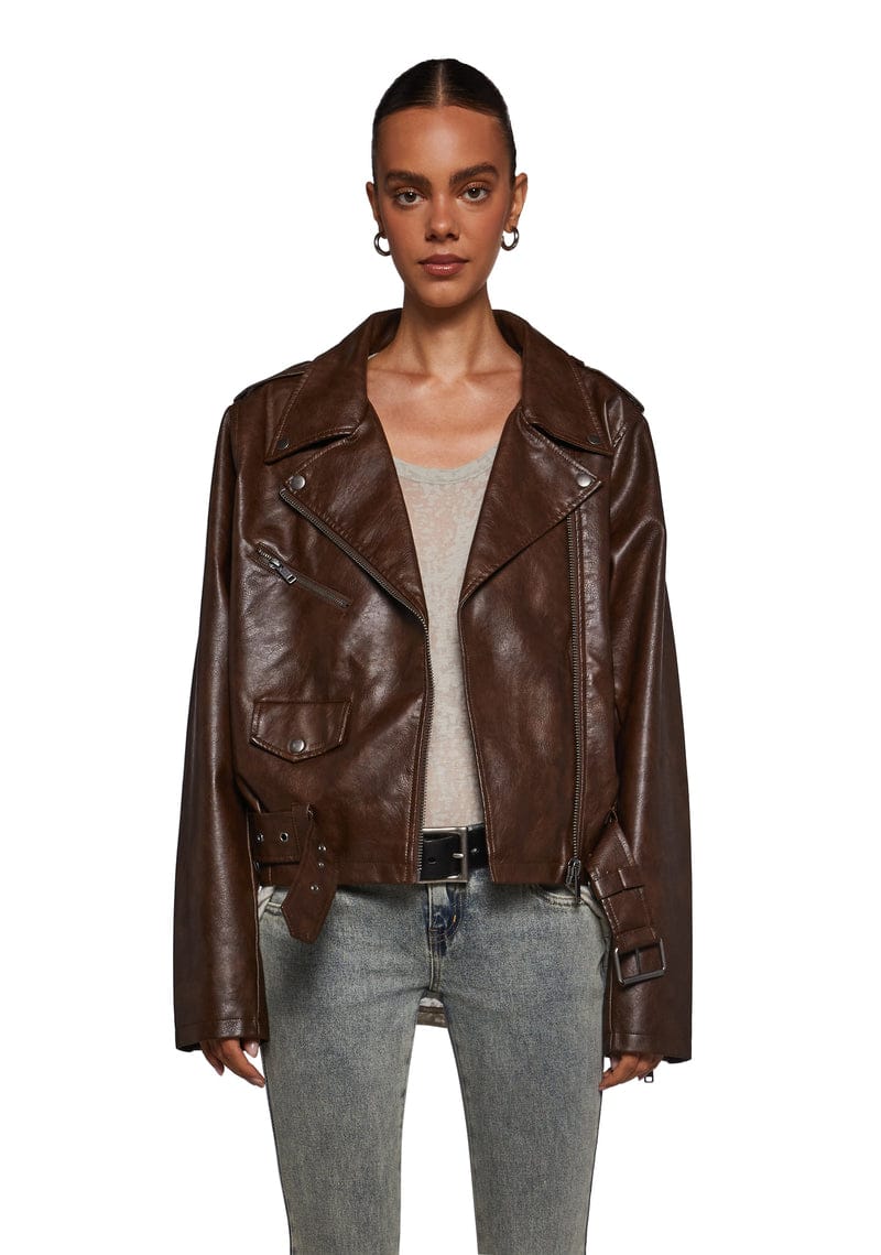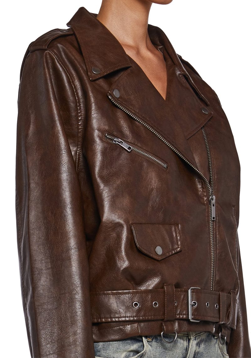 The jacket is a classic biker jacket, characterized by its asymmetrical zipper, wide lapels, and antique hardware.