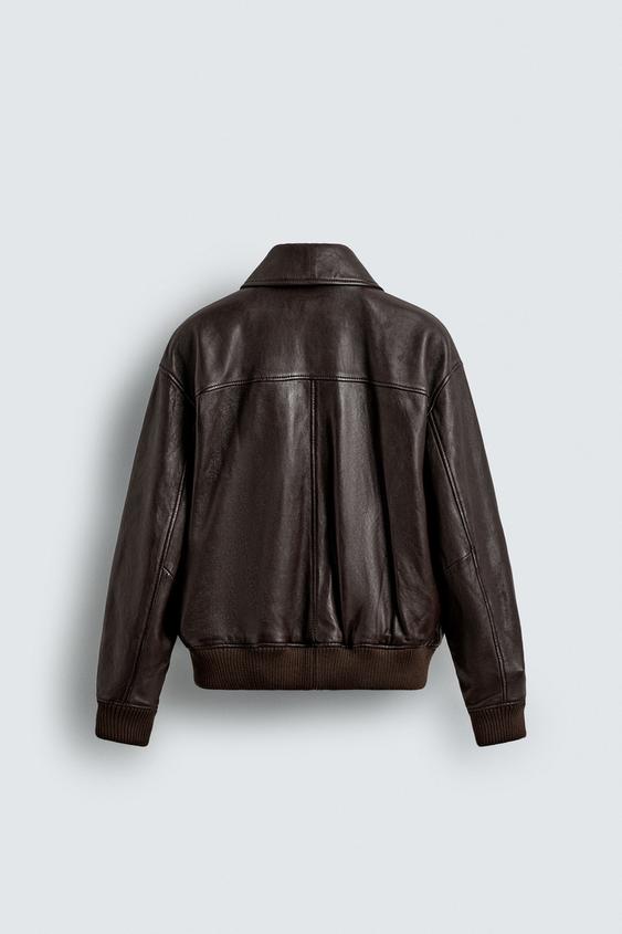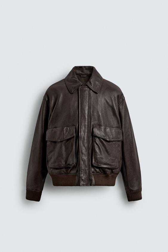 Relaxed fit leather jacket. Lapel collar and long sleeves. Front patch pockets with flaps. Interior pocket detail. Ribbed trim. Front zip closure hidden by a snap-button placket.