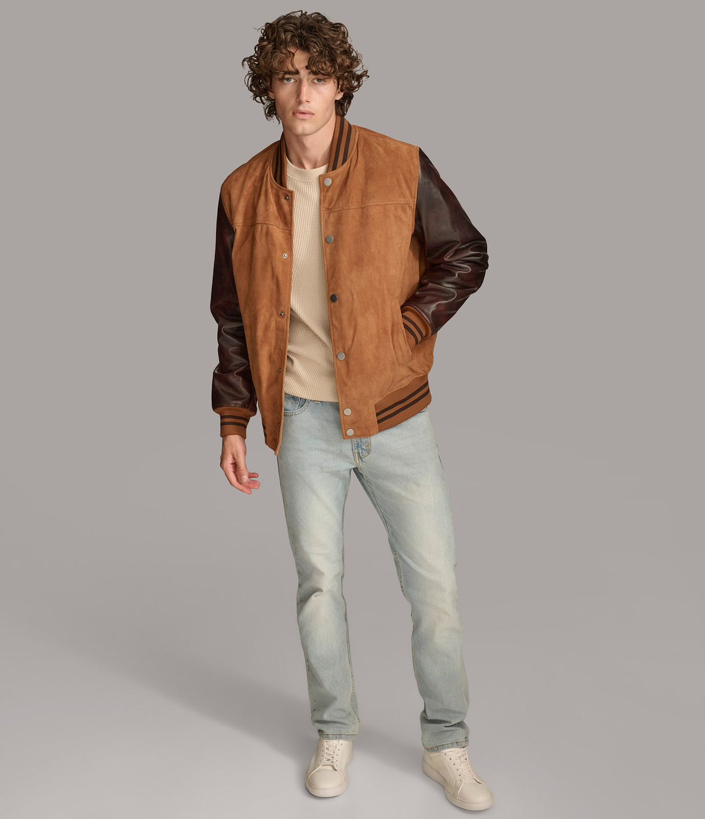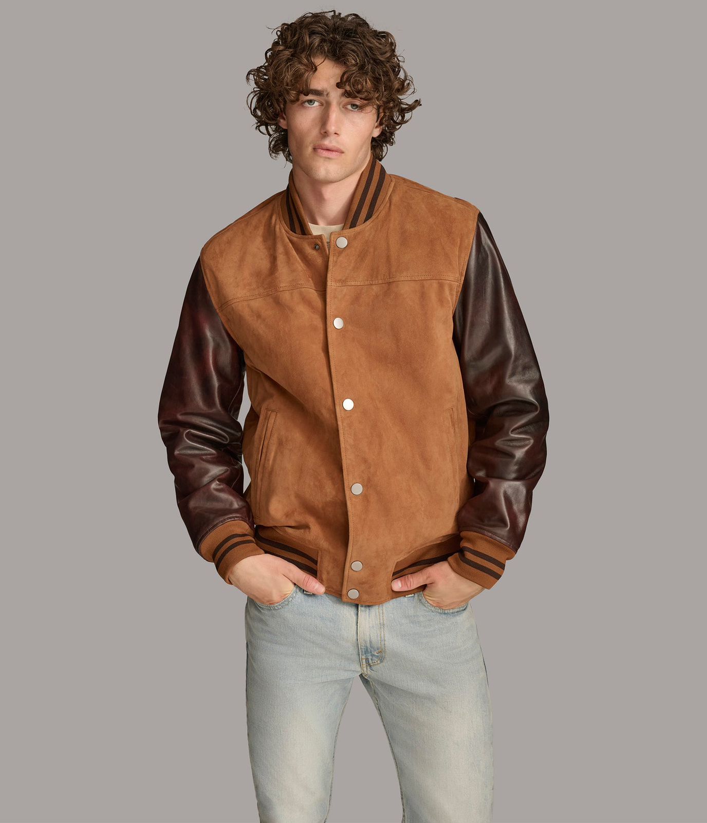 This is a varsity-style jacket featuring a suede body and leather sleeves. It has a snap-button front closure and ribbed cuffs and collar with striped details.