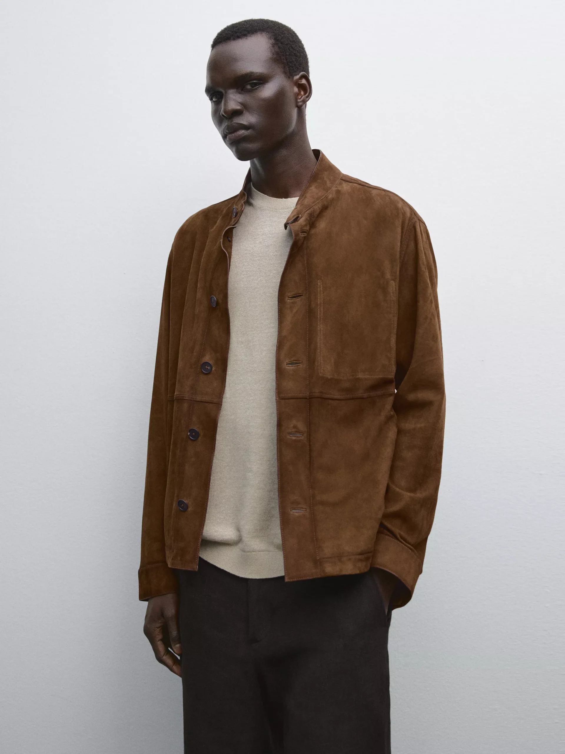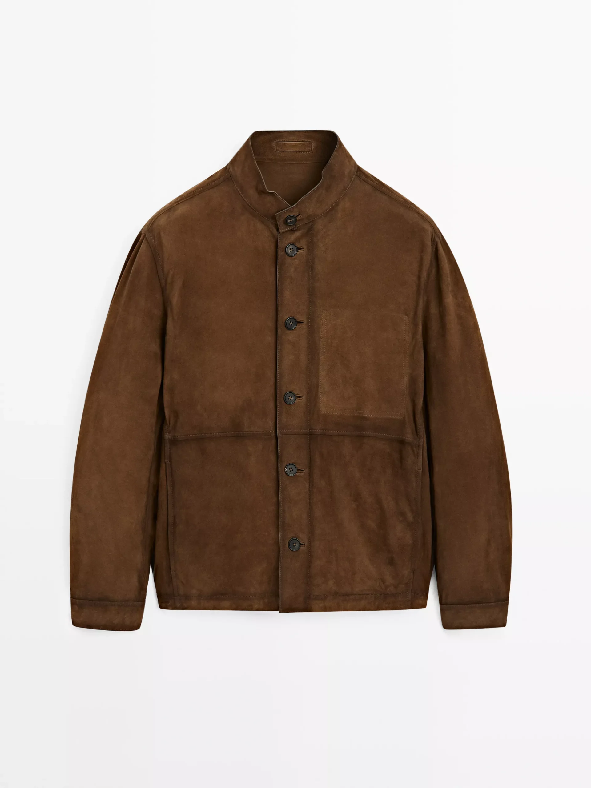 Jacket made of goatskin leather with suede finish. Long sleeves with buttoned cuffs. Collar with buttoned tab. Button-up front. Inside pockets. Seam details .